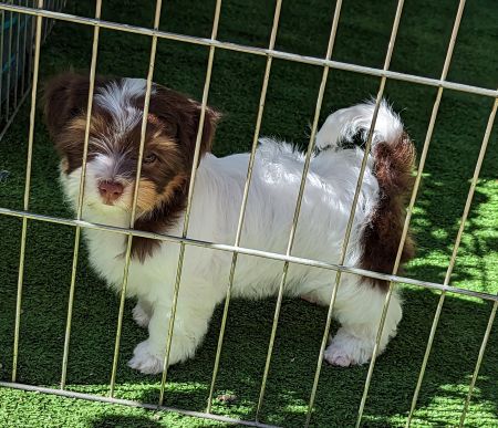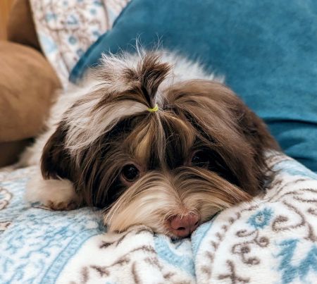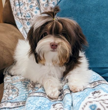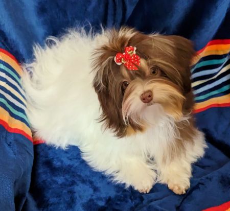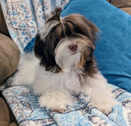 This is Flurry. She was born May 19, 2025 and is currently 9 months old. Flurry weighs just 6 1/2 lbs and is white with chocolate spots & tan markings. She will be too small to breed and has been vet diagnosed with a Grade 4 patella which may eventually require surgery, so I am rehoming her. The vet emphasized keeping her slim & preventing jumps on/off furniture to minimize stress on her patellas. She’s doing great in other ways. Flurry is a very affectionate, playful little girl. She is crate trained, no issues with car rides, gets along great with the other dogs, has a silky coat so she doesn’t mat, & is fully vaccinated except for rabies (I’ve held off due to her small size). She should not be spayed before 12-14 months so her body can benefit from the hormones for proper bone & ligament development. Price is $800 with a spay contract.