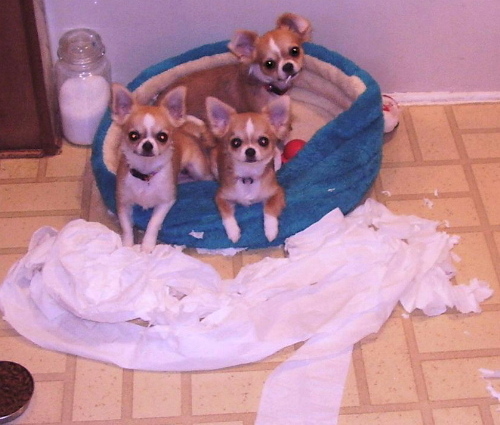 Naughty puppies!! It rained, so they couldn't play outside but the toilet paper kept them very busy. Iris, Violet, and Rico (in the back) said they didn't know where it all came from, it just fell out of the sky! 100% NOT Guilty! |